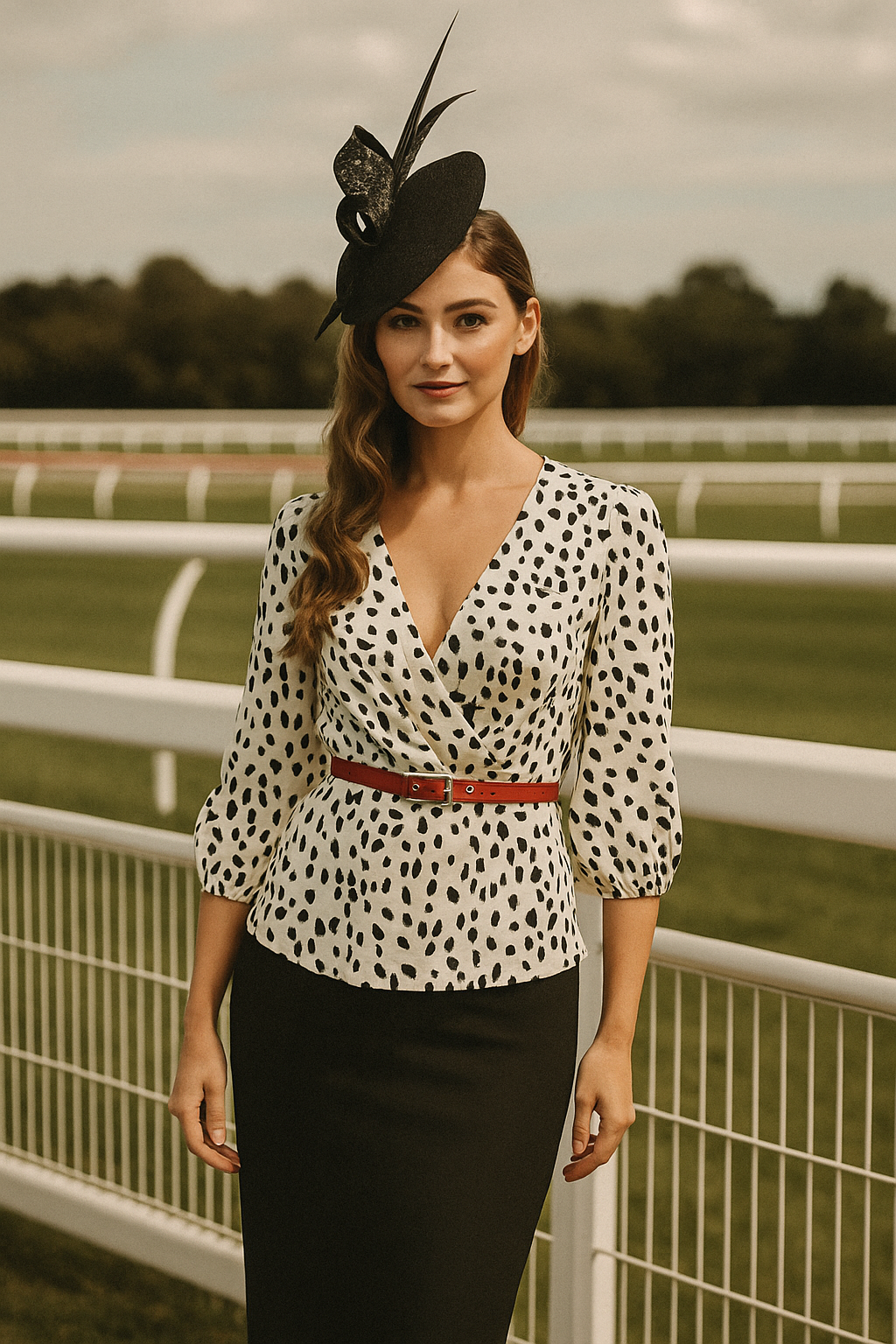Navy spotted two piece peplum vintage Katies chiffon suit.